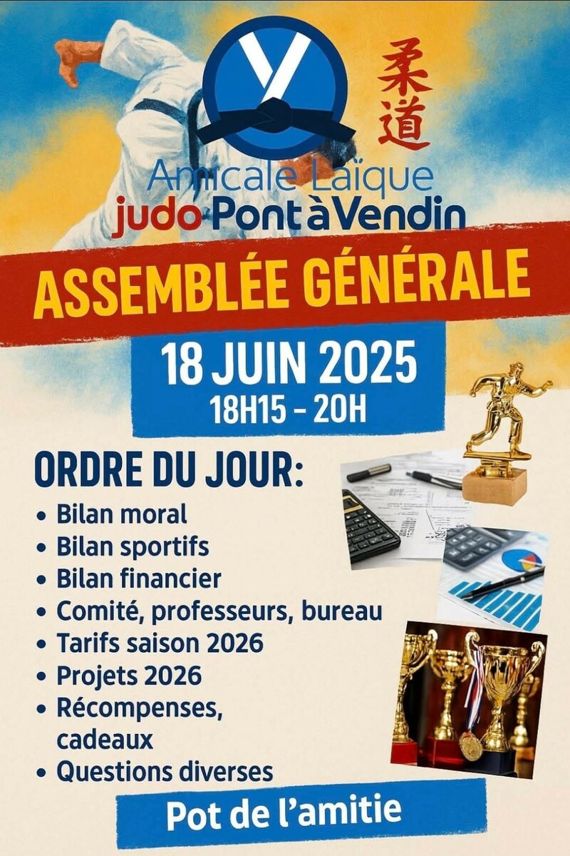 Nous vous convions à l'assemblée générale du club, qui se tiendra le mercredi 18 juin à 18h15 au local du club de football situé au stade, derrière le dojo. L'ordre du jour est ci-joint.